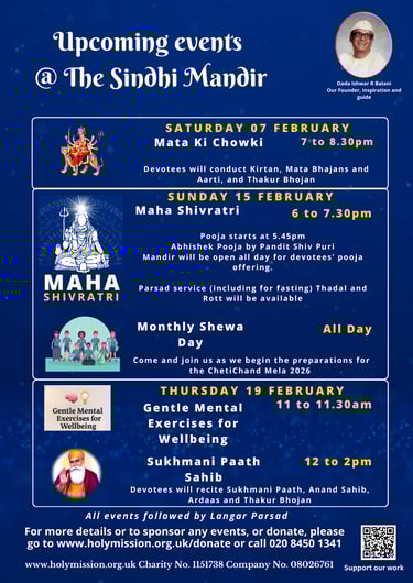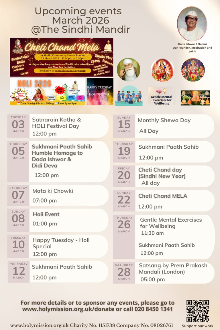 Holy Mission, also known as Sindhi Community House or Sindhi Mandir, is a dynamic community center in Cricklewood that brings together people from around the UK, especially those based in Barnet, Brent, and Harrow. Facilitated by over 120 volunteers, it organises over 200 events annually to support social welfare and improve life conditions for individuals affected by various social, economic, or physical challenges. The centre offers a broad array of activities including spiritual and cultural events, music, dance and keep fit events, health and well-being events, bereavement support, day centre with luncheon facilities, to name a few.